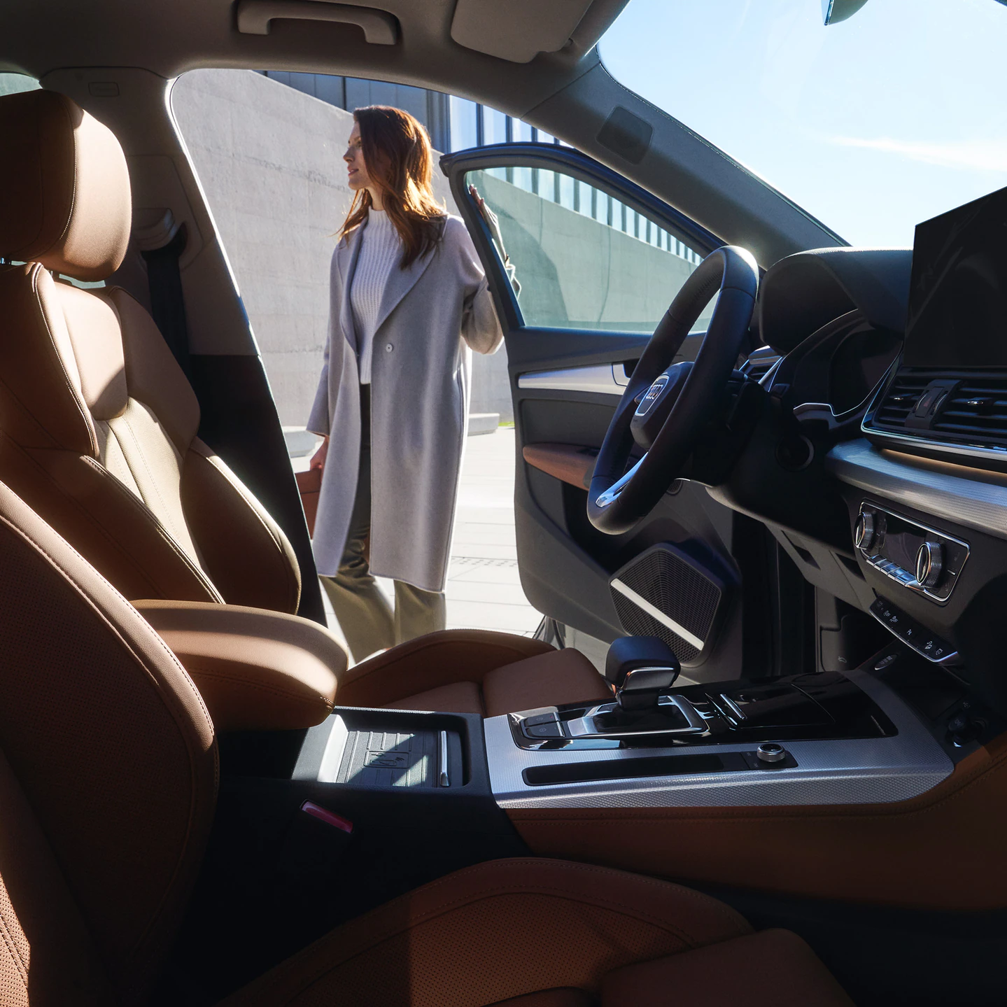 아우디 Q5의 5인승 실내 공간은 넉넉한 헤드룸 및 레그룸이 포함되어 더욱 여유롭습니다. 시트가 높게 자리해 주변 교통 상황에 대한 탁 트인 시야를 제공합니다. 차체를 가로지르는 수평 라인이 차량의 넓은 폭과 편안함을 강조해 줍니다. 계기판의 전체 너비를 따라가는 트림 스트립은 차량 내부의 우아한 분위기를 세련되게 마무리합니다. 앰비언트 라이트는 실내공간에 매력적인 분위기를 연출합니다.